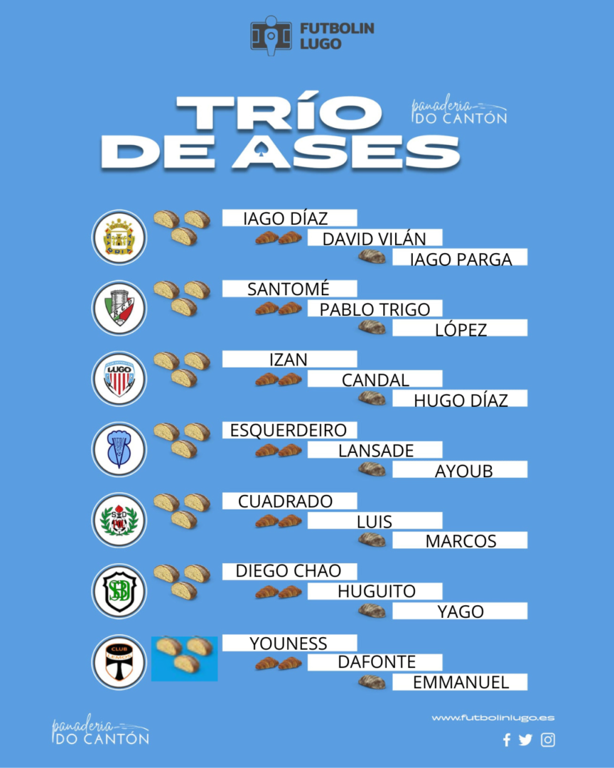O Trío de Ases O Cantón deu de si unha xornada con moitos estados de ánimo. Ledicia tanto no Lemos como no Racing Villalbés despois de gañar os seus encontros e manterse moi vivos na loita pola promoción. Deixou a súa vez un bo sabor de boca en Viveiro e non tanto no Lugo B nn derbi provincial con reparto de puntos . Tamén tivo unha doble derrota na Preferente máis goleadora e un pau tremendo para a Sarriana e a súa loita por salvar a categoría.